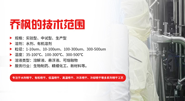 喬楓發(fā)明了新的低溫噴霧干燥技術(shù),在低溫的狀態(tài)下保持物料活性,某種程度上可以取代凍干機,大幅度的提高生產(chǎn)產(chǎn)能。適用于(司美格魯肽、多肽、氨基酸、多種酶菌、多種蛋白、噬菌體、 抗生素、微膠囊、等物料,詳情請咨
